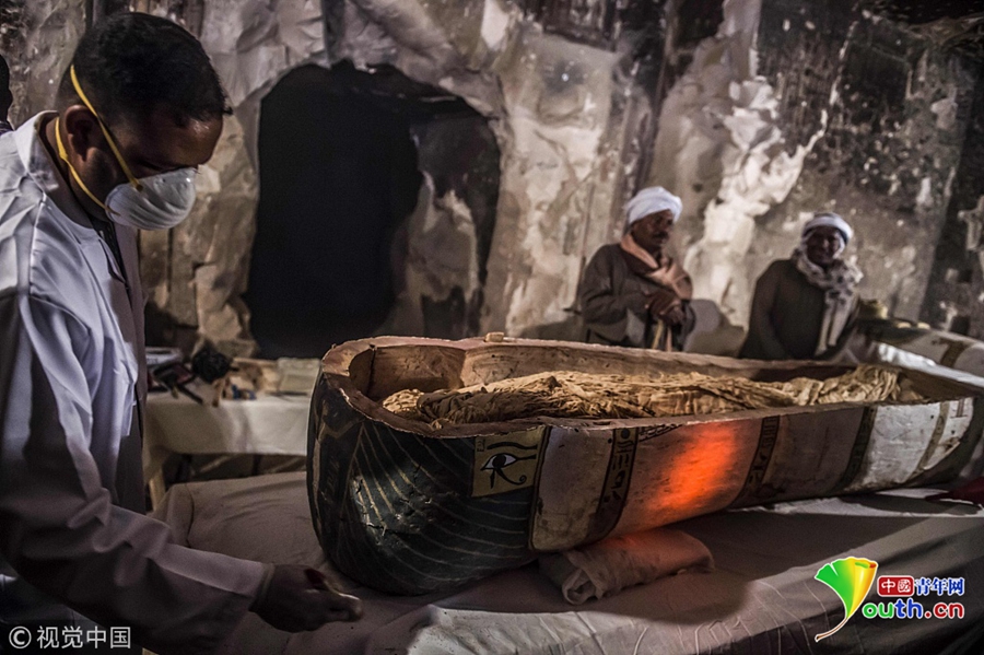 當(dāng)?shù)貢r間2018年11月24日,埃及盧克索,考古學(xué)家在當(dāng)?shù)匕l(fā)掘出一處墓穴,在其中發(fā)現(xiàn)石棺、木乃伊等文物,時間可追溯至公元前4-7世紀(jì)。
