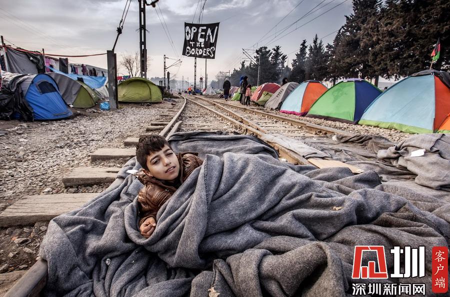 當(dāng)?shù)貢r(shí)間2016年3月22日,希臘伊多梅尼,來自敘利亞阿勒頗的難民男孩躺在鐵軌上睡覺。