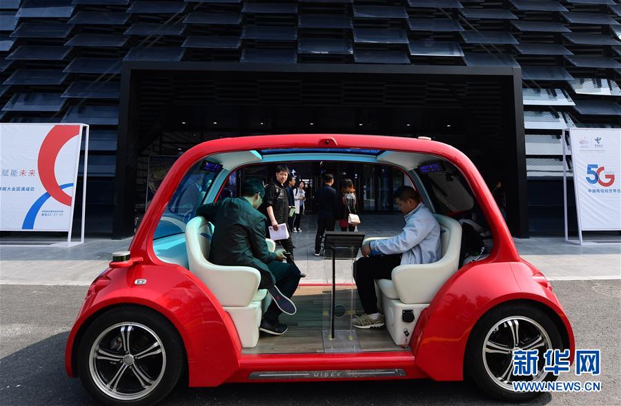 10月21日在浙江烏鎮(zhèn)舉行的互聯(lián)網(wǎng)之光博覽會會場外拍攝的5G無人駕駛體驗車。新華社記者尹棟遜攝