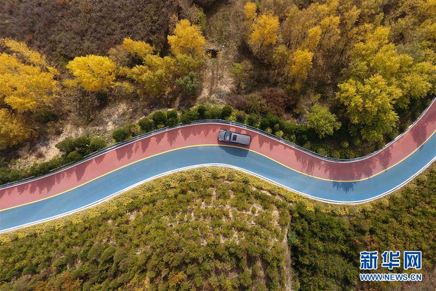 車輛行駛在山西省太原市西山旅游公路上(10月22日無人機拍攝)。