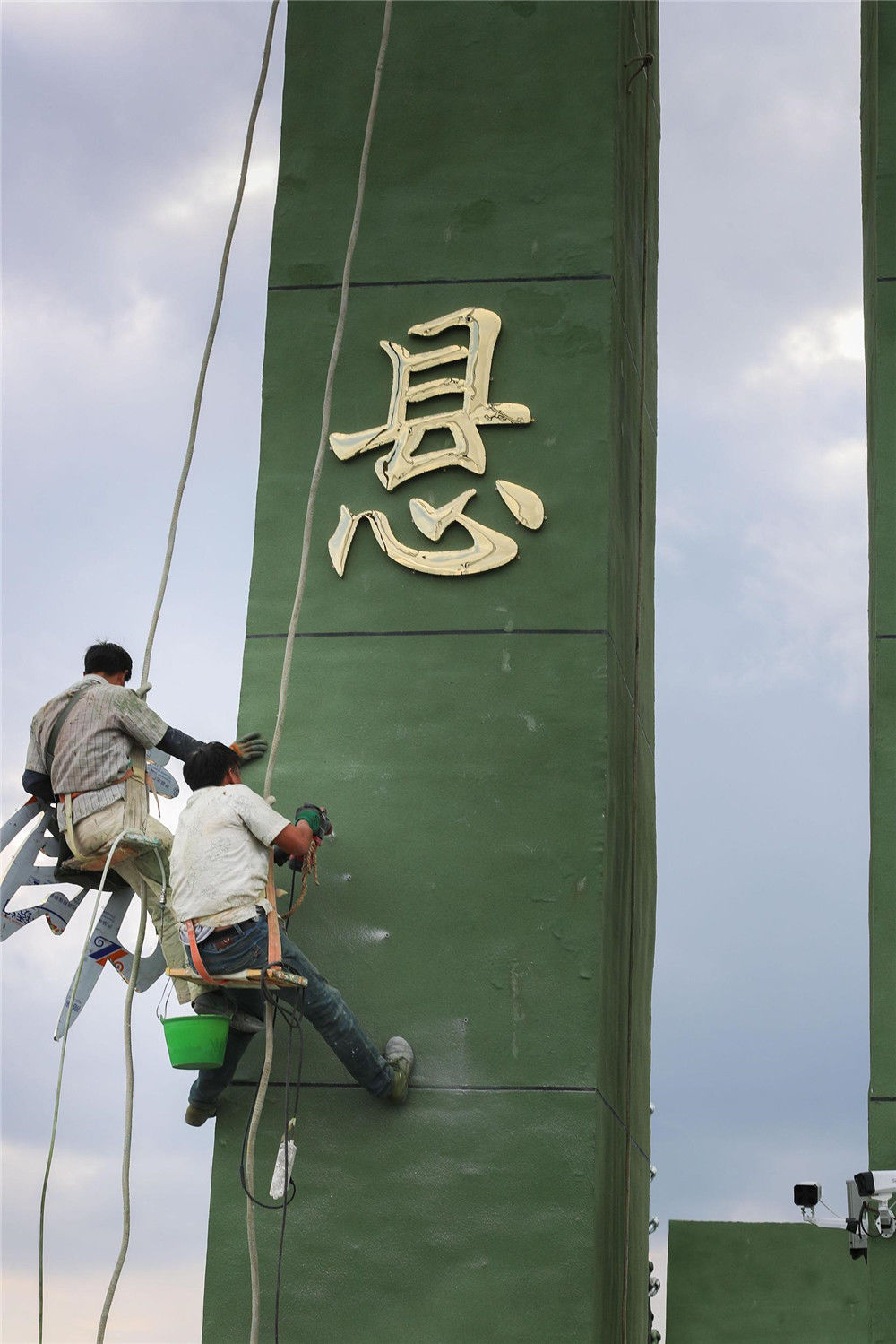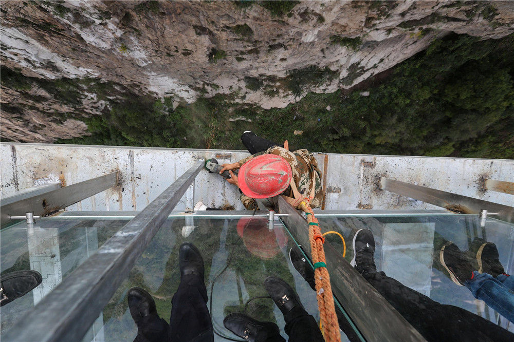 2019年9月20日,從落差198米懸崖上伸出周長60米懸空的“高空玻璃懸廊”在河南南陽七峰山落成,該玻璃懸廊名為“云頂之心”。圖為建筑工人進行收尾工作。王中舉(河南分社)/中新社/視覺中國編輯/康娜