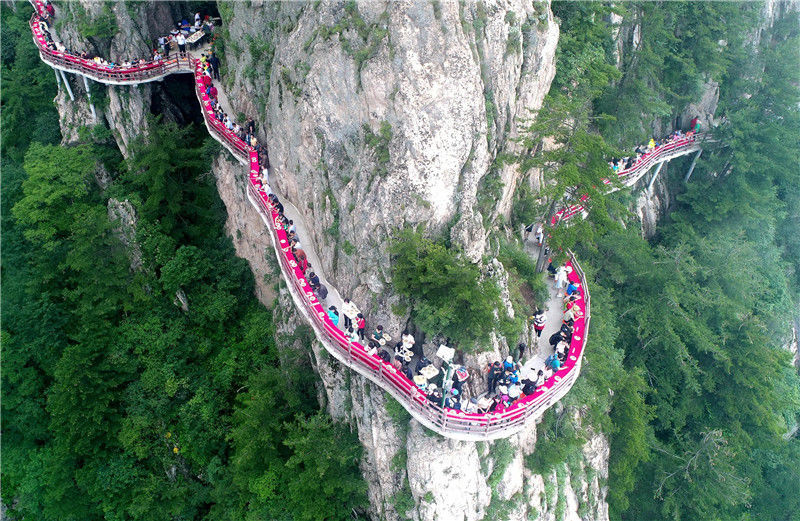 2019年6月24日,河北省邯鄲市東太行云端棧道天脊攬勝。東太行景區(qū)位于武安市境內(nèi)太行山東麓,登山棧道全部在峭壁上,游人登山如在云端漫步。金書懷/視覺中國