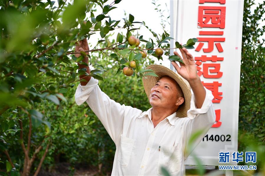 在河南省信陽市光山縣槐店鄉(xiāng),農(nóng)民在聯(lián)興油茶基地查看油茶果生長(zhǎng)狀況(9月4日攝)。新華社記者馮大鵬攝