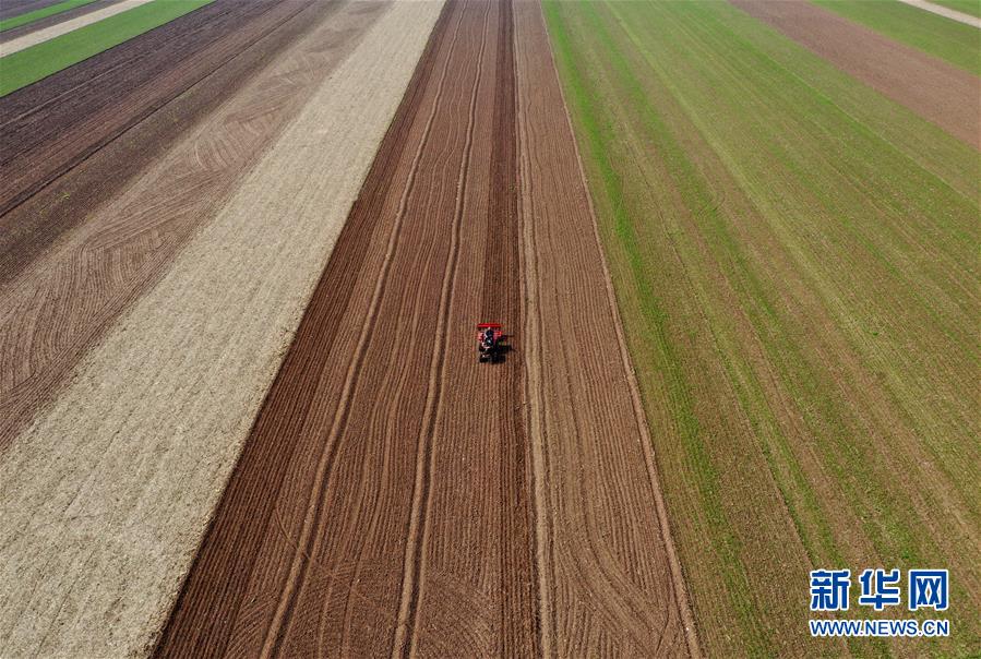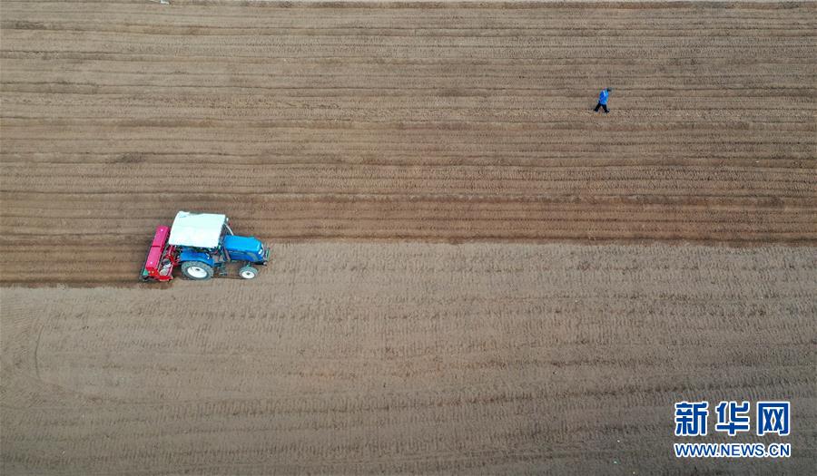 河南省寶豐縣趙莊鎮(zhèn)周營(yíng)村農(nóng)民駕駛機(jī)械在農(nóng)田里犁地(10月17日無人機(jī)拍攝)。