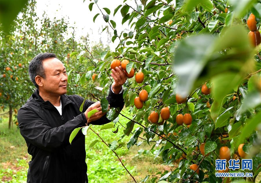 種植戶李應(yīng)賢在河南省洛寧縣馬店鎮(zhèn)關(guān)廟村查看金珠沙梨生長(zhǎng)情況(10月9日攝)。新華社記者李嘉南攝