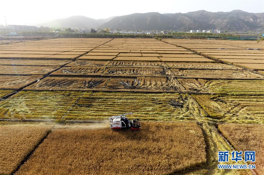 收割機(jī)在太原市晉源區(qū)赤橋村稻田里作業(yè)(10月28日無人機(jī)拍攝)。新華社記者詹彥攝