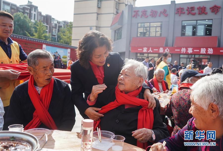 11月2日,南京仙林街道黨工委書(shū)記孫金娣(前左二)在千家宴上給老人們戴上圍巾,送上祝福。 新華社記者 季春鵬 攝