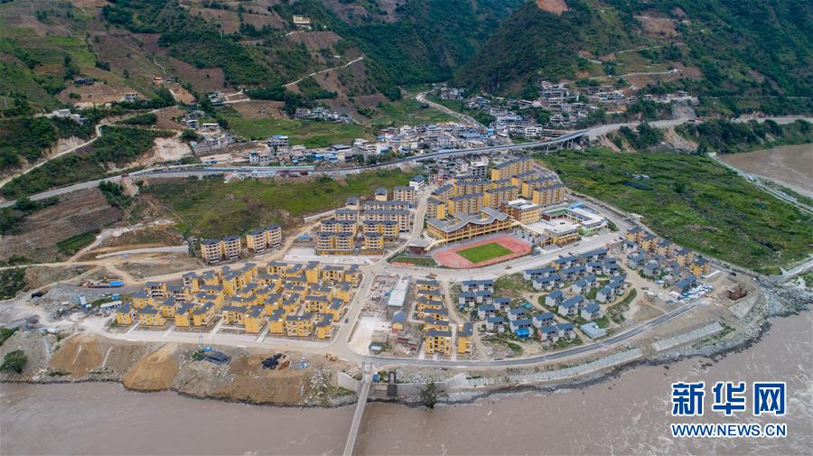 建于怒江邊的大興地鎮(zhèn)維拉壩“珠海小區(qū)”內(nèi)的學(xué)校和住房已初現(xiàn)規(guī)模(6月24日無人機拍攝)。新華社記者胡超攝
