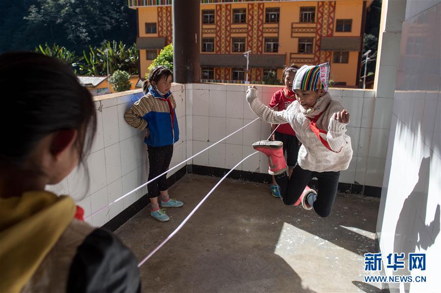 在獨龍江鄉(xiāng)中心小學(xué),孩子們在跳皮筋(2016年11月23日攝)。新華社記者胡超攝