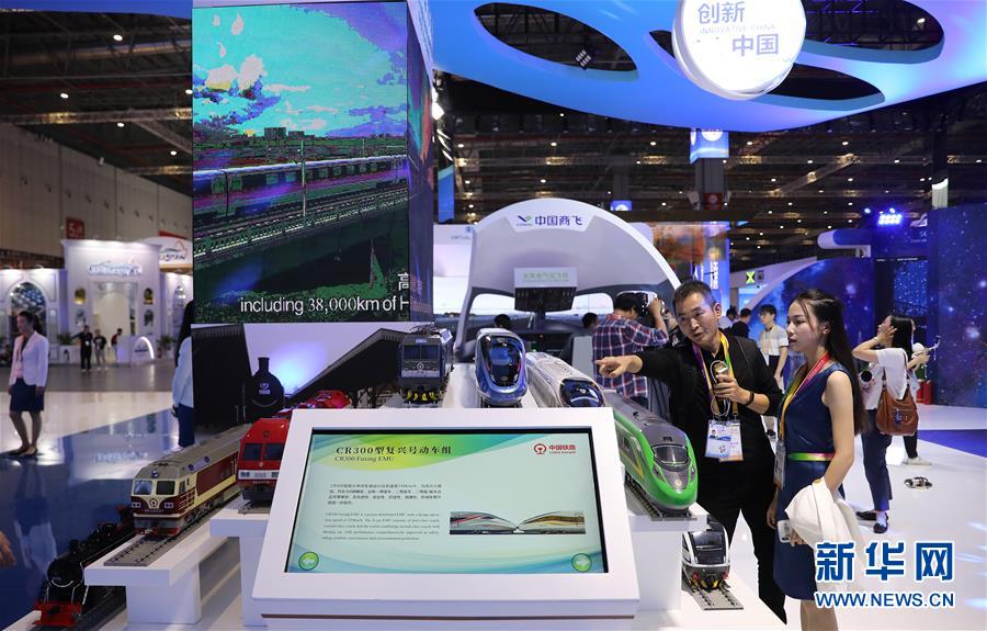 11月2日,在第二屆中國(guó)國(guó)際進(jìn)口博覽會(huì)國(guó)家展展區(qū)內(nèi)的中國(guó)館,工作人員在一組中國(guó)鐵路展品旁討論交流。 新華社記者 方喆攝