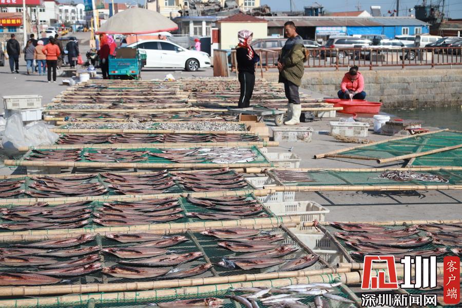漁民在山東省青島西海岸新區(qū)瑯琊鎮(zhèn)瑯琊港碼頭上晾曬海魚。