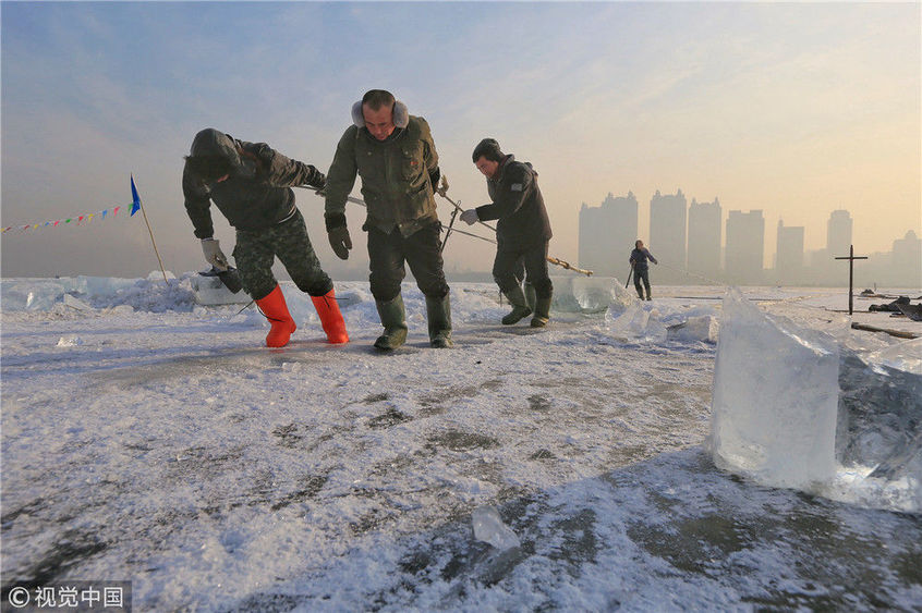 2018年12月11日,黑龍江省哈爾濱市,松花江上,采冰者們彎腰拉繩,宛如纖夫般拽重達半噸的冰塊出水。采冰者都是自哈市江北萬寶、東發(fā)、沙陀子等鄉(xiāng)鎮(zhèn)的農(nóng)民,他們每年冬閑時都會親屬、村鄰之間結(jié)伴到松花江畔采冰,有的采冰人,已經(jīng)連續(xù)干了二十多年。每個采冰季,他們每天要在冰面上工作10-12個小時,每個采冰組,一天要拽出冰塊2000-3000塊,一個近20天的采冰季,每人能收入近萬元。