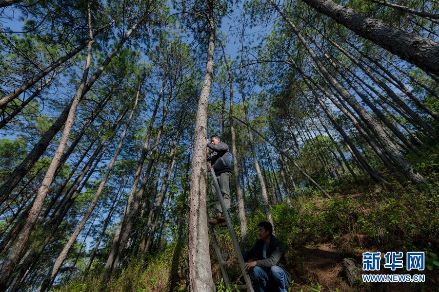 羅康(上)在哀牢山的松樹(shù)林里安裝人工鳥(niǎo)巢(12月12日攝)。 新華社記者 胡超 攝
