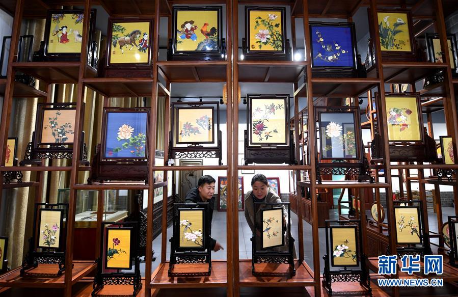 12月14日,在河北定州緙絲傳習基地,工作人員(右)在給游客介紹緙絲作品。定州緙絲是一種以蠶絲為原料,采用“通經斷緯”技法織成的雙面平紋織物,工藝繁雜,經得起摸、擦、揉、搓、洗,有著“千年不壞的藝術織品”之譽,2013年被列入河北省第五批非物質文化遺產名錄。近年來,河北定州積極推介緙絲,促進緙絲產業(yè)發(fā)展。 新華社記者 王曉 攝