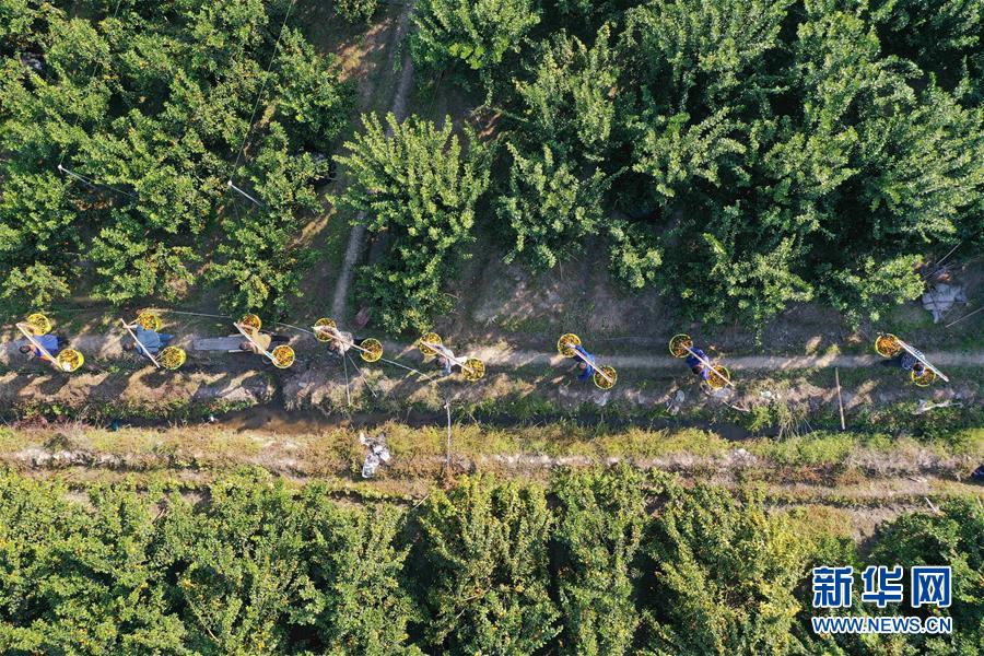 在廣西柳州市鹿寨縣四排鎮(zhèn),村民在果園里采收柑橘(12月11日無人機(jī)拍攝)。部分柑橘通過李柳萍的電商平臺(tái)外銷。新華社記者黃孝邦攝