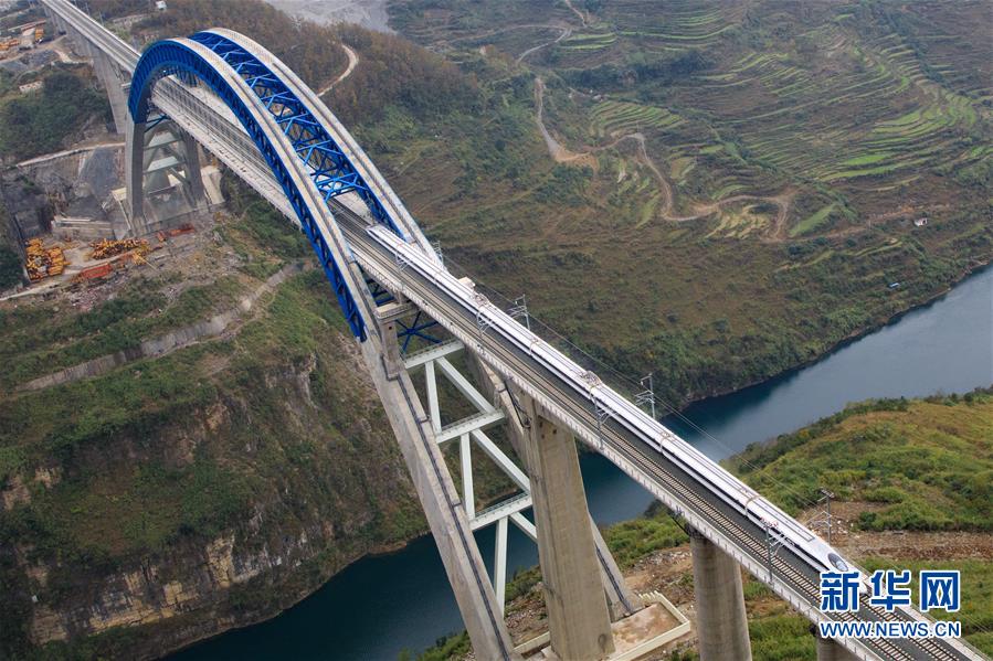 12月2日,一輛試驗(yàn)列車駛過(guò)成貴高鐵鴨池河特大橋。當(dāng)日,正在進(jìn)行聯(lián)調(diào)聯(lián)試的成貴高鐵進(jìn)入全線拉通空載模擬運(yùn)行階段,試驗(yàn)列車將在成都到貴陽(yáng)區(qū)間內(nèi)全線路運(yùn)行。線路全長(zhǎng)650公里的成貴高鐵是我國(guó)“八縱八橫”高速鐵路網(wǎng)的重要組成部分,設(shè)計(jì)時(shí)速為250公里。新華社記者劉續(xù)攝