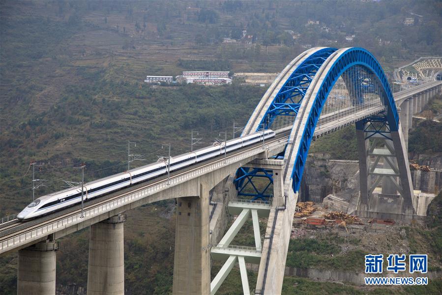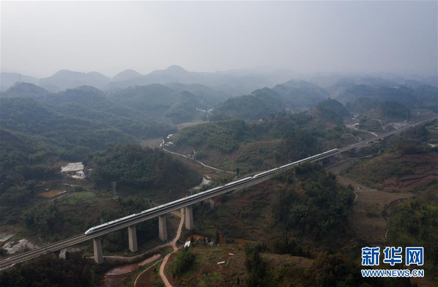 12月16日,一列動(dòng)車組列車從成貴高鐵鴨池河特大橋上駛過(guò)。新華社記者歐東衢攝