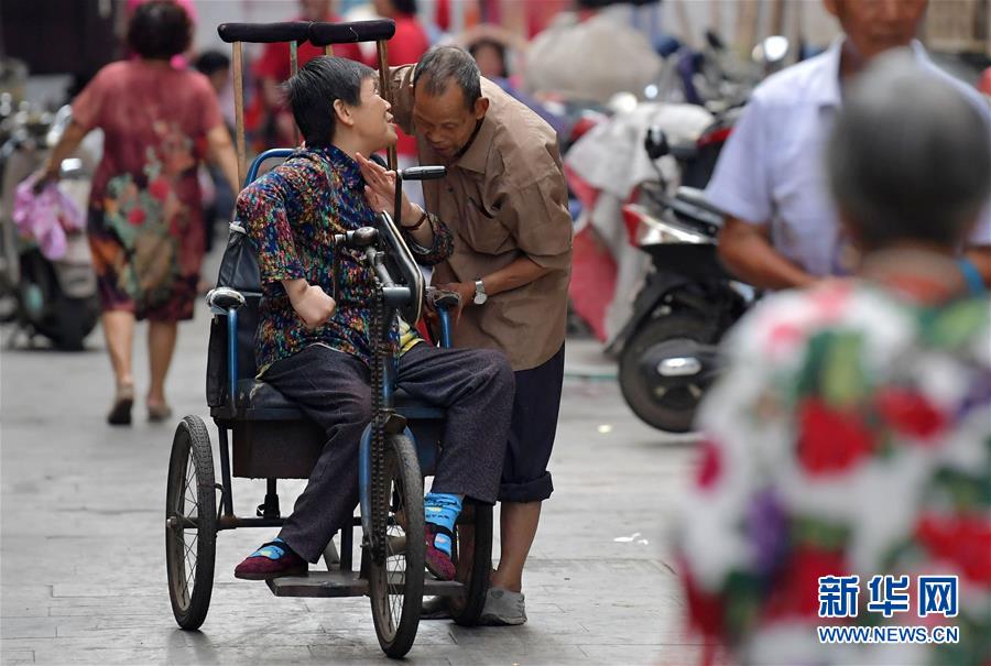 葉文娟在熊金根耳邊交代要買的東西(10月2日攝)。江西省南昌市西湖區(qū)繩金塔社區(qū)有一對特殊的夫妻,74歲的丈夫熊金根聽力殘疾,67歲的妻子葉文娟患小兒麻痹癥后行動不便。夫妻二人相互照顧相濡以沫度過了30余年。新華社記者彭昭之攝