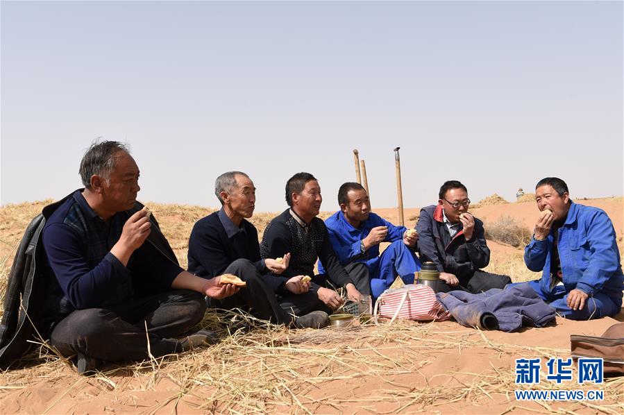 在甘肅省古浪縣境內(nèi)的黑崗沙風沙口,八步沙第二代治沙人賀中強(左一)、郭萬剛(左二)、石銀山(左三)、羅興全(右三)、程生學(右二)、王志鵬(右一)在休息間隙吃午飯(3月26日攝)。二十世紀八十年代,八步沙是騰格里沙漠南緣甘肅省古浪縣最大的風沙口。當?shù)亓荒挲g加在一起近300歲的老漢,在承包沙漠的合同書上按下手印,誓用白發(fā)換綠洲。38年過去,六老漢只剩兩位在世。