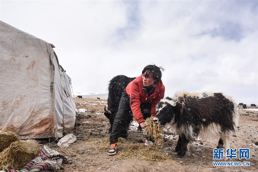 2月22日,才巴拉加在麥雄灘的帳篷前給牛犢喂飼料。今年年初,青海省玉樹藏族自治州遭遇重度雪災,部分地區(qū)積雪深度超過半米,牲畜覓食困難,餓死凍死超2萬頭只。麥雄灘位于巴顏喀拉山腳下的玉樹藏族自治州稱多縣清水河鎮(zhèn)文措村,是此次玉樹雪災中化雪較快、接納受災轉(zhuǎn)場外地牧民最多的地點之一。文措村黨支部書記白尕召集村民開會,大家一致同意拿出30萬畝草場,供受災更嚴重的其他地區(qū)牧民使用。新華社記者吳剛攝