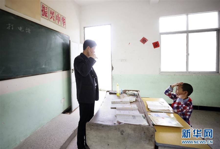 5月8日,王北海(左)在教室內(nèi)為陳威宇講解“打電話”的流程。江西省瑞金市大柏地鄉(xiāng)三河小學坐落于大山深處。陳威宇是學校里唯一的學生。陳威宇今年9歲,家庭貧困,上學不便。為解決這一難題,當?shù)卣疀Q定恢復陳威宇家附近三河小學的辦學工作,今年46歲的王北海被安排為專職教師,從周一至周五,王北海幾乎每天24小時陪伴在陳威宇身旁,既當老師也當“家長”,照料他的學習和生活。新華社記者蘭紅光攝