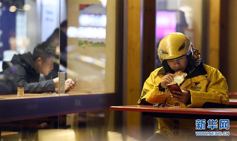 1月27日晚,送餐的間隙,來自湖南岳陽的“外賣小哥”丁鴻在一家餐廳外一邊啃面包一邊看手機。臨近春節(jié),萬家團圓,而城市里的外賣配送員仍然騎行在街頭巷尾,將美食和春節(jié)祝福一起準時送達。新華社記者李尕攝