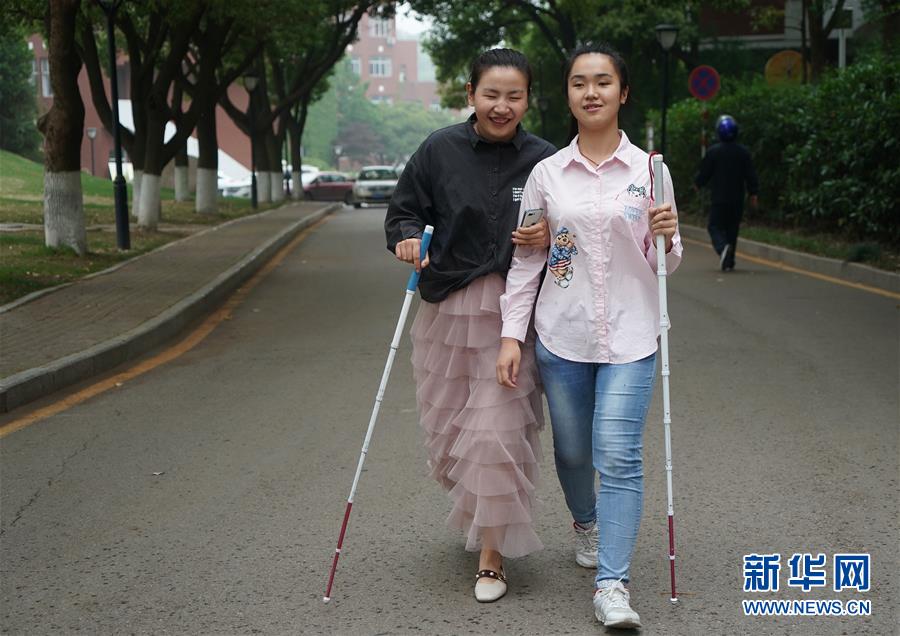 5月17日,在南京特殊教育師范學院,周文晴(右)和鄔逸帆走在校園內(nèi)。1997年出生的鄔逸帆和1998年出生的周文晴都是從小失去視覺。她們學習努力,相互幫助,大學生活和同齡人一樣豐富多彩。新華社記者季春鵬攝