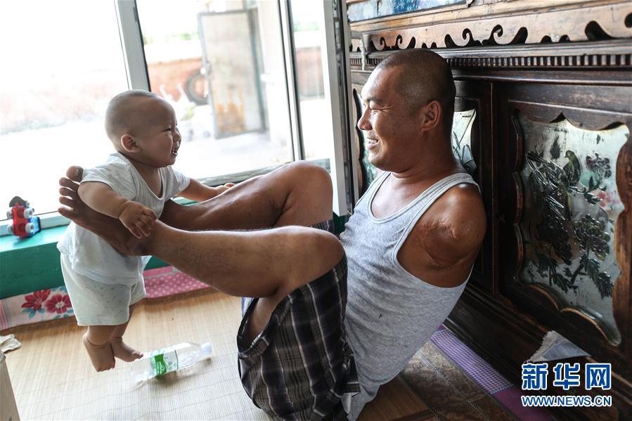 8月8日,王剛與兒子“肉肉”在家中玩耍。33歲的王剛來自遼寧省鐵嶺市昌圖縣兩家子鎮(zhèn)河西村。作為父親,王剛雖然沒有堅實的臂膀去擁抱自己的孩子,但他一直努力用自己的方式呵護照顧家人。“無臂爸爸”的父愛給很多人帶來了力量和鼓舞,被人親切地稱為“最強爸爸”。新華社記者潘昱龍攝