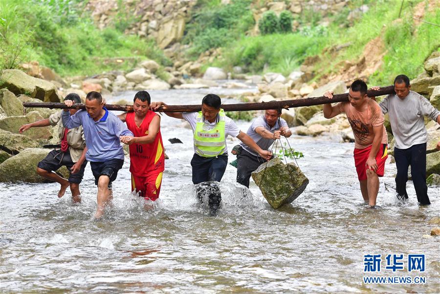 在位于黔桂交界的烏英苗寨,駐村第一書記韋桂華(右四)、黨員梁成兵(右三)、梁志新(左二)帶領村民維修河堤(6月30日攝)。烏英苗寨聯(lián)合黨支部在各項工作中積極發(fā)揮引領作用,帶領群眾穩(wěn)步走在脫貧致富的道路上。新華社記者黃孝邦攝