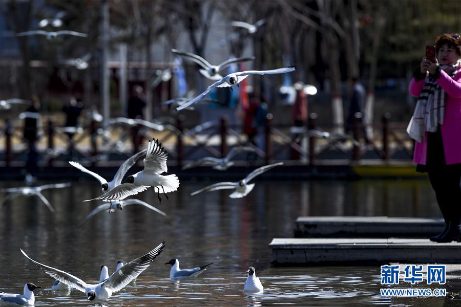 紅嘴鷗在寧夏銀川市燕鴿湖公園覓食(3月21日攝)。 新華社記者 馮開(kāi)華 攝