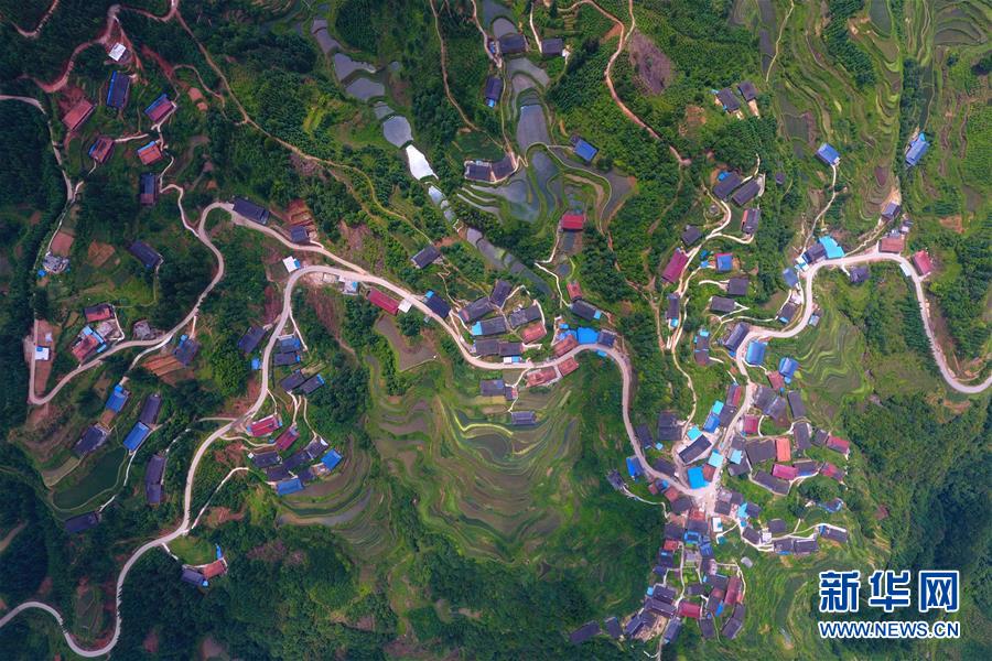 在融水苗族自治縣桿洞鄉(xiāng)黨鳩村下黨鳩屯,道路已經(jīng)修到家家戶戶門前(6月21日無人機(jī)拍攝)。新華社記者黃孝邦攝