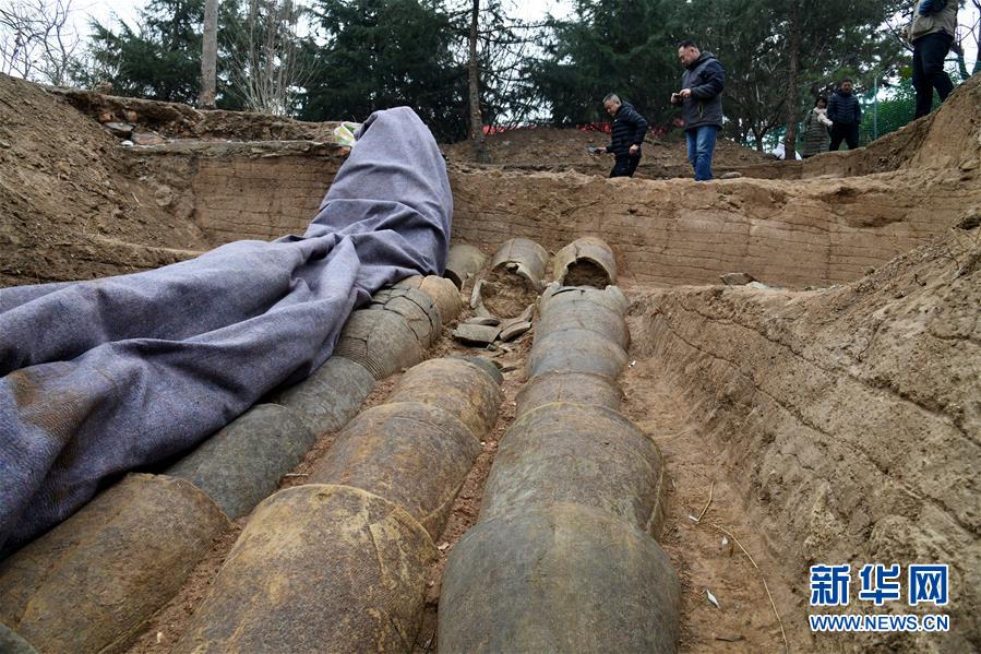 12月21日拍攝的瑯琊臺(tái)遺址考古發(fā)掘現(xiàn)場(chǎng)。三組整齊的陶制管道規(guī)整排列,管道較粗,管壁較厚,陶水管為兩端大小各異的標(biāo)準(zhǔn)件,與現(xiàn)代城市地下排水管件類似。新華社記者李紫恒攝