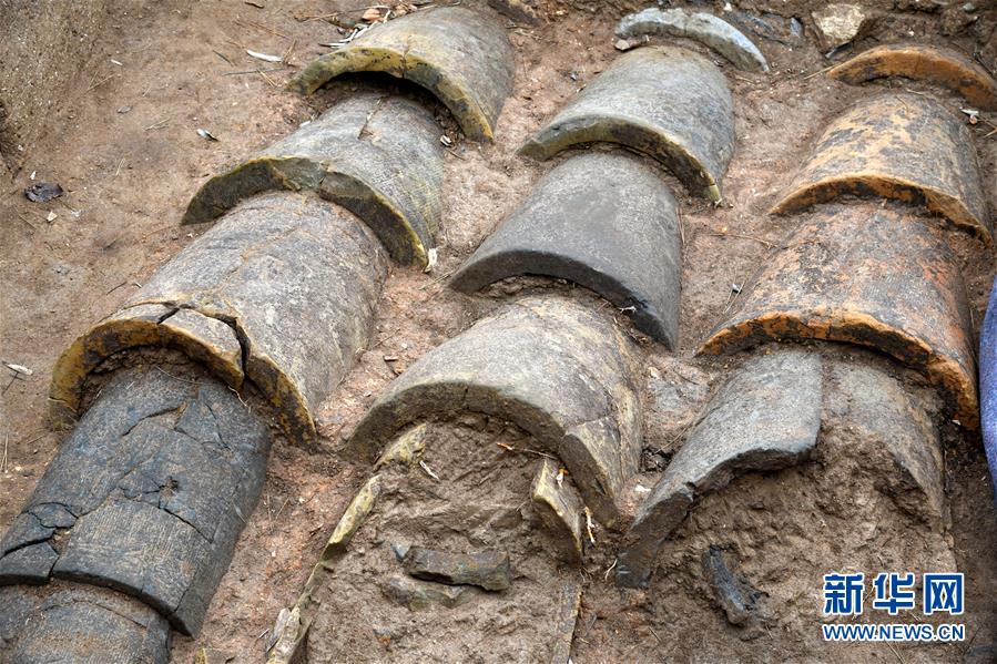 瑯琊臺遺址考古發(fā)掘現(xiàn)場的陶制管道(12月21日攝)。新華社記者李紫恒攝