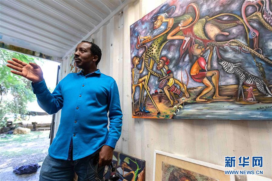 12月20日,在肯尼亞內羅畢庫奧納藝術中心,一名畫家介紹自己的作品。 新華社記者 王騰 攝