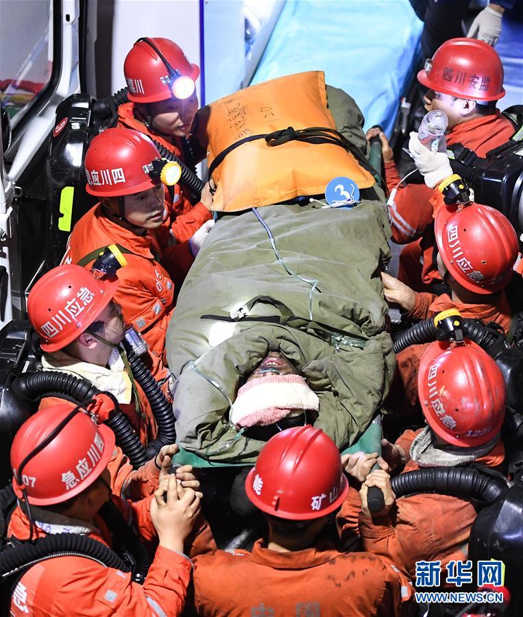 12月18日,救援人員轉(zhuǎn)運(yùn)安全升井的被困人員。 當(dāng)日7時56分,經(jīng)過80多個小時的緊張救援,發(fā)生透水事故的川煤集團(tuán)杉木樹煤礦13名被困人員全部安全升井。 新華社記者 薛玉斌 攝