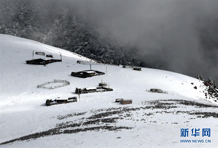 川藏線四川理塘縣境內(nèi)的雪山和民居(10月17日攝)。新華社記者陳天湖攝