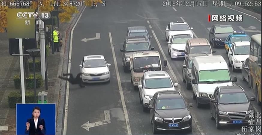 大概10分鐘左右,一名男子小跑著橫穿機(jī)動(dòng)車道,在高某被撞的同一地點(diǎn),也被一輛白色小車給撞倒。而這名男子正是高某的丈夫。