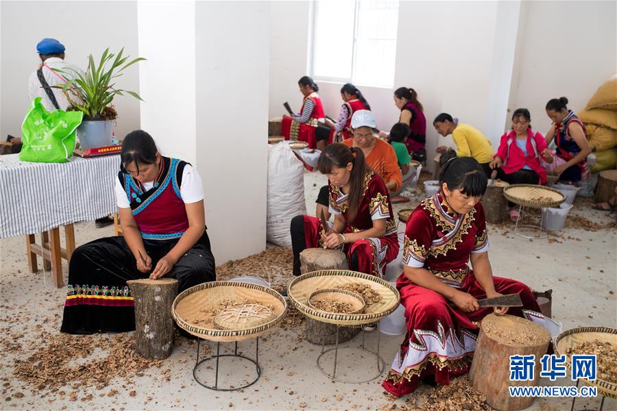 在大興地鎮(zhèn)維拉壩“珠海小區(qū)”內的農(nóng)產(chǎn)品加工扶貧車間,村民們在剝核桃仁(6月24日攝)。新華社記者胡超攝