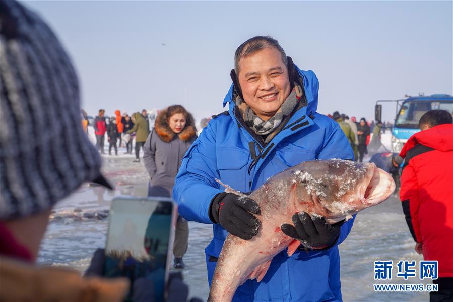 12月27日,在查干湖冰面上,游客手捧剛打撈上來的大魚拍照留念。新華社記者張楠攝