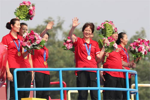 2019年10月1日,慶祝中華人民共和國(guó)成立70周年大會(huì)在北京天安門廣場(chǎng)隆重舉行。這是中國(guó)女排亮相“祖國(guó)萬(wàn)歲”彩車。新華社記者歐東衢攝