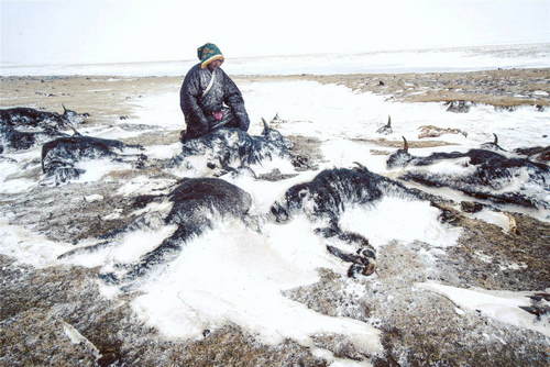 2019年2月23日,青海省玉樹(shù)藏族自治州稱(chēng)多縣扎朵鎮(zhèn)治多村牧民坐在自家被凍死的牦牛前。2018年12月下旬以來(lái),玉樹(shù)州境內(nèi)多次大范圍降雪,部分地區(qū)遭受重度、特重度雪災(zāi)。 新華社記者吳剛攝