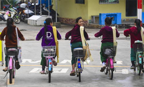 2019年3月8日,在云南省瑞麗市姐相鄉(xiāng)銀井村,銀井小學(xué)幾名緬籍學(xué)生騎車(chē)回家,跨過(guò)銀井邊防口岸國(guó)境線(xiàn)。每天清晨,都有一群孩子通過(guò)銀井邊防站,從緬甸來(lái)到瑞麗市銀井小學(xué)讀書(shū)。新華社記者李曉果攝