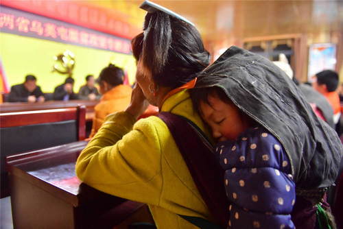 2019年3月14日,一名婦女背著小孩參加烏英苗寨脫貧產(chǎn)業(yè)會(huì)議。烏英苗寨位于桂黔交界的大苗山深處,共有140戶600多人,其中100戶屬廣西柳州市融水苗族自治縣桿洞鄉(xiāng)黨鳩村,40戶屬貴州省從江縣翠里瑤族壯族鄉(xiāng)南岑村。這里交通不便,土地資源匱乏,自然環(huán)境惡劣,曾經(jīng)是一個(gè)極度貧困的苗寨。2019年,全寨共有44戶貧困戶實(shí)現(xiàn)脫貧,貧困戶已從2016年的92戶減少到目前的4戶。新華社記者黃孝邦攝