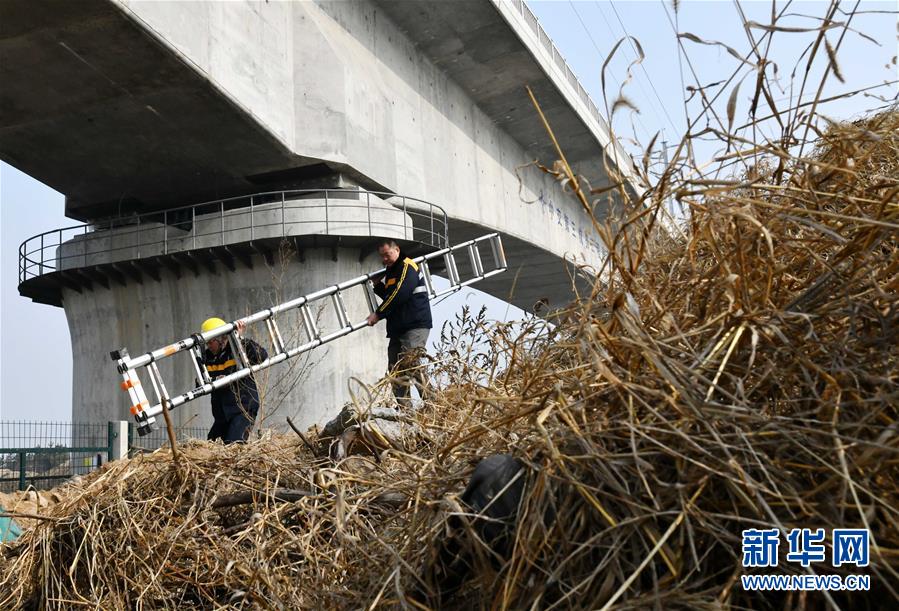 1月3日,中國(guó)鐵路濟(jì)南局臨沂工務(wù)段工程技術(shù)員在沂河特大橋橋墩上檢查。新華社記者 朱崢攝