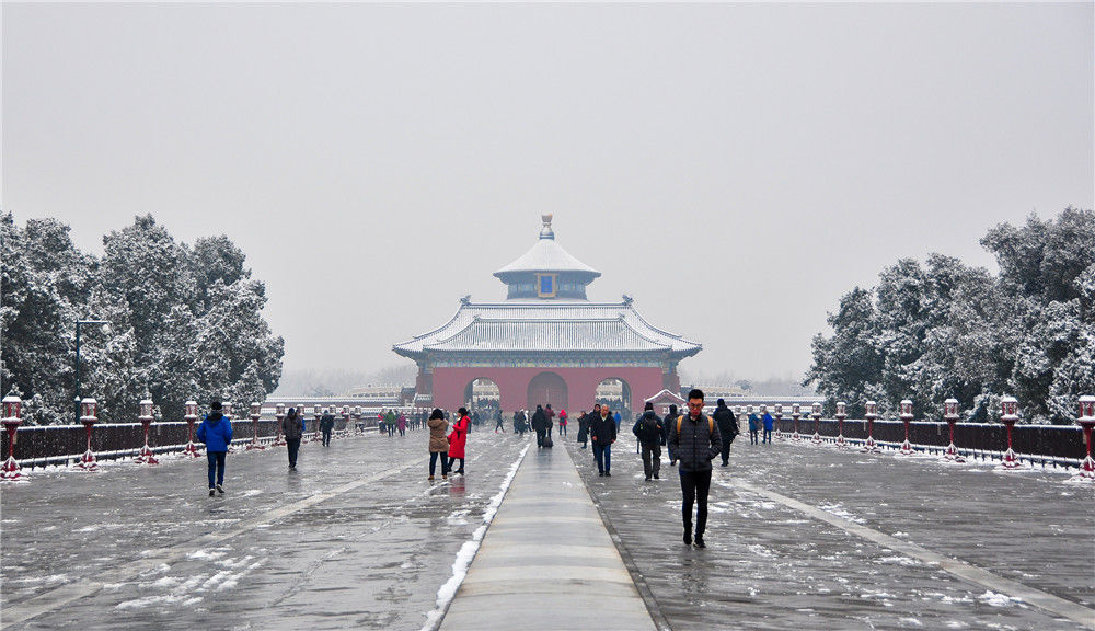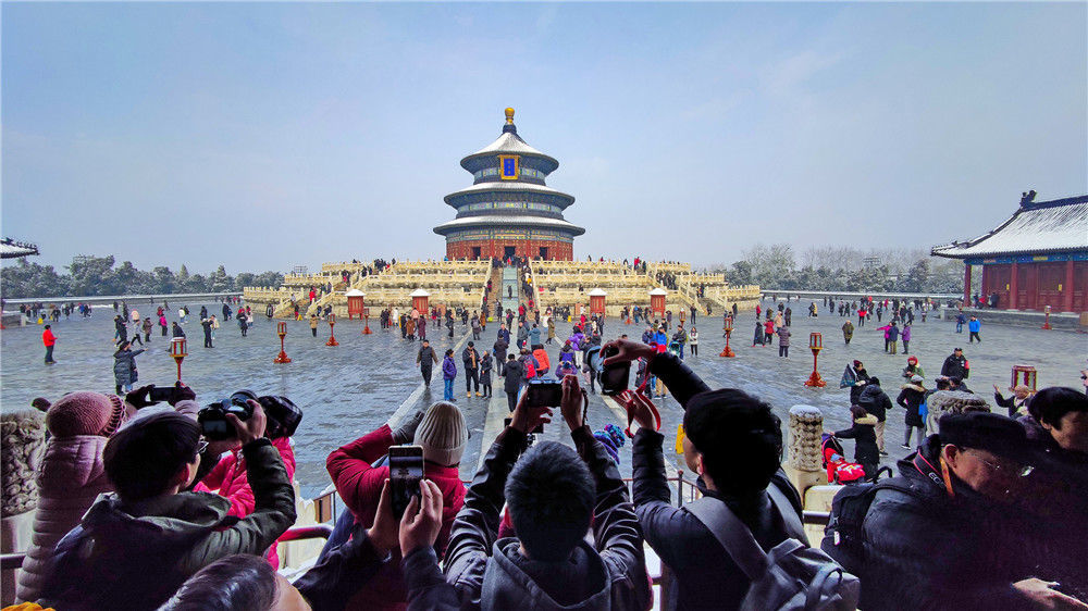 2019年11月30日,北京,天壇公園里觀雪賞景的市民絡(luò)繹不絕。喬健/千龍圖像/視覺中國