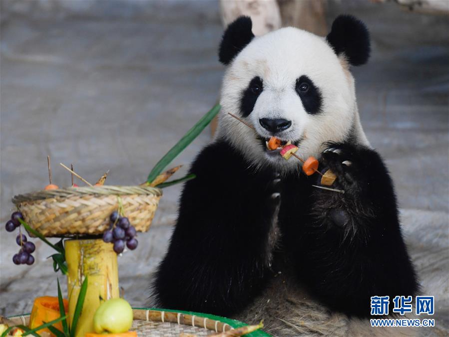 2019年12月31日,大熊貓“貢貢”在“擼串”。 當(dāng)日是2019年最后一天,海南熱帶野生動(dòng)植物園的工作人員為園區(qū)內(nèi)大熊貓“貢貢”“舜舜”準(zhǔn)備了用葡萄、南瓜、竹筍等果蔬制作的“火鍋串串香”,讓它們用“擼串”的方式迎接新年的到來。 新華社記者 楊冠宇 攝