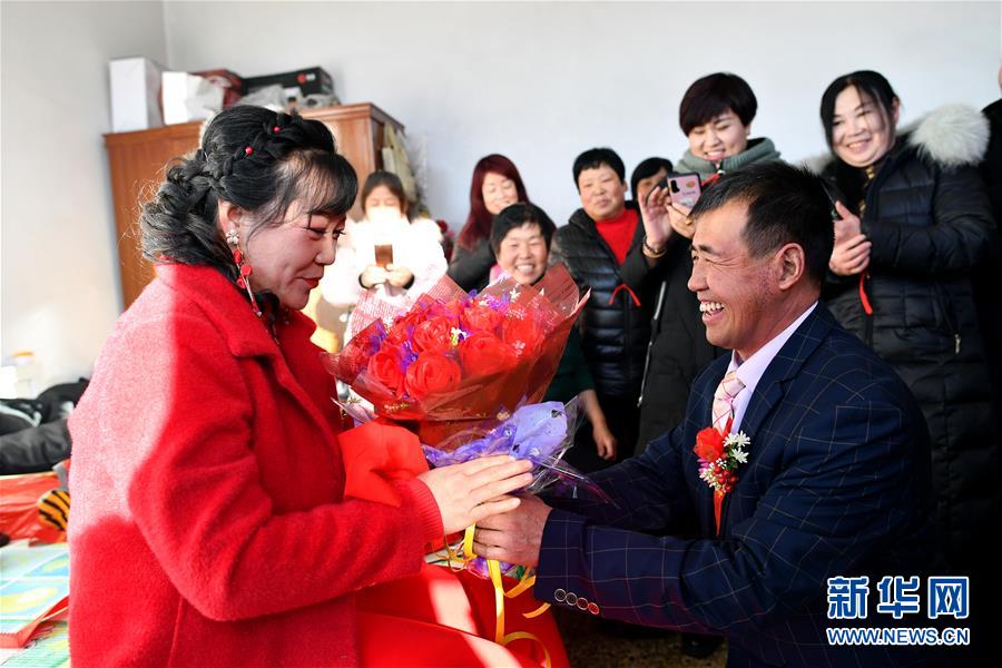 在和順縣李陽鎮(zhèn)南李陽村,新郎馬愛明將花送給新娘溫麗芳(2019年12月31日攝)。 農(nóng)歷臘月初六,是山西省和順縣李陽鎮(zhèn)下石勒村45歲的馬愛明娶媳婦的日子。 地處太行山區(qū)的下石勒村曾深陷貧困,“地下無資源、地上沒產(chǎn)業(yè)”是這里的真實(shí)寫照。2013年,村里638口人中有511口屬貧困人口。村民在貧瘠的坡地上種的玉米、谷子等僅夠糊口,外村女子都不愿嫁到這里。和村里多數(shù)人一樣,貧困戶馬愛明不得不在農(nóng)閑時(shí)出去打工補(bǔ)貼家用。東走走、西走走,馬愛明沒攢下錢,也沒遇見合適的人,婚事一拖再拖,成了大齡“光棍”。 2013年以來,在國(guó)家強(qiáng)有力的政策幫扶和基層黨組織的帶領(lǐng)下,下石勒村以合作社的形式發(fā)展起肉牛養(yǎng)殖、雙孢菇種植、萬壽菊種植等集體產(chǎn)業(yè)。下石勒村經(jīng)濟(jì)有了起色,外出打工的村民紛紛回村。馬愛明加入了村里的建筑隊(duì),閑時(shí)還到種植專業(yè)合作社打工,一年四季都有活干。加上土地流轉(zhuǎn)的收入,馬愛明一年能收入三萬多元。2016年,下石勒村實(shí)現(xiàn)整村脫貧。 2019年,馬愛明結(jié)識(shí)了在下石勒村肉雞養(yǎng)殖專業(yè)合作社打工的李陽鎮(zhèn)南李陽村村民溫麗芳,馬愛明的樸實(shí)、善良、勤勞打動(dòng)了溫麗芳,兩人擦出了愛情的火花。 臘月初六這天,下石勒村鑼鼓喧天,嗩吶齊鳴。在鄉(xiāng)親們的見證下,馬愛明手牽新娘,大聲宣布:“我脫單了!我的幸福生活開始了!” 新華社記者 詹彥 攝