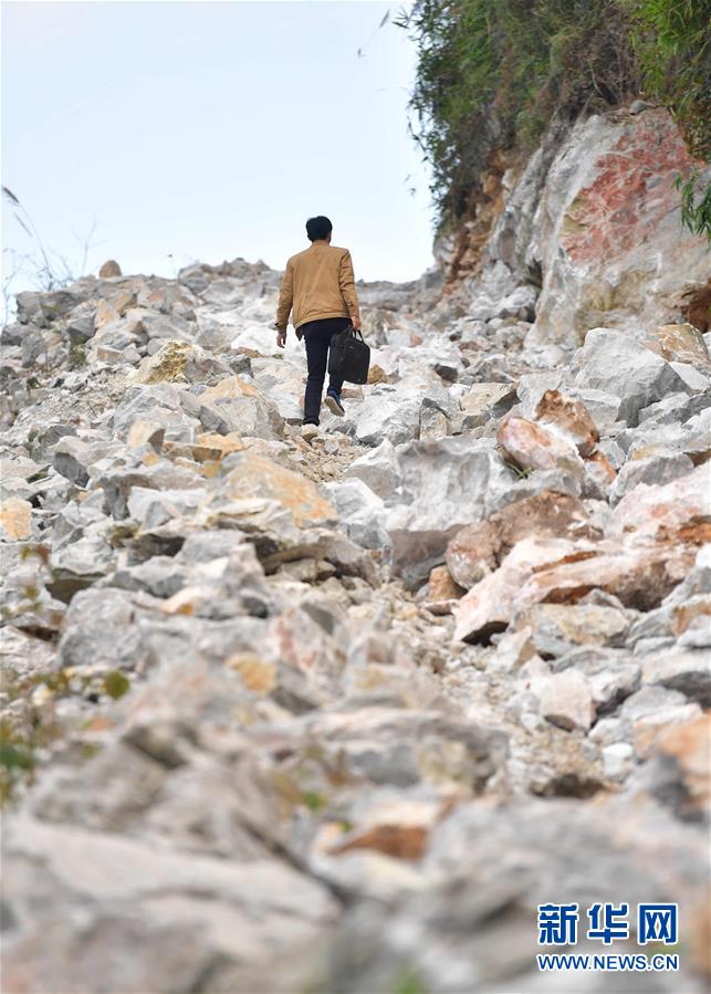 八好村駐村第一書記韋德徒步前往弄麻屯開展扶貧工作,弄麻屯的公路尚在建設(shè)當(dāng)中(2019年12月16日攝)。新華社記者黃孝邦攝