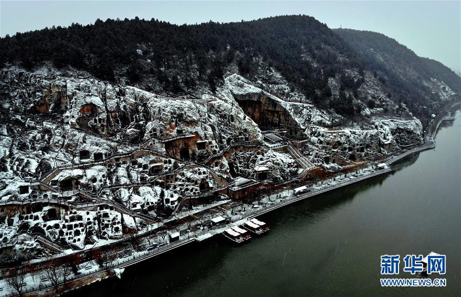 1月9日無人機(jī)拍攝的洛陽龍門石窟雪景。新華社記者李安攝