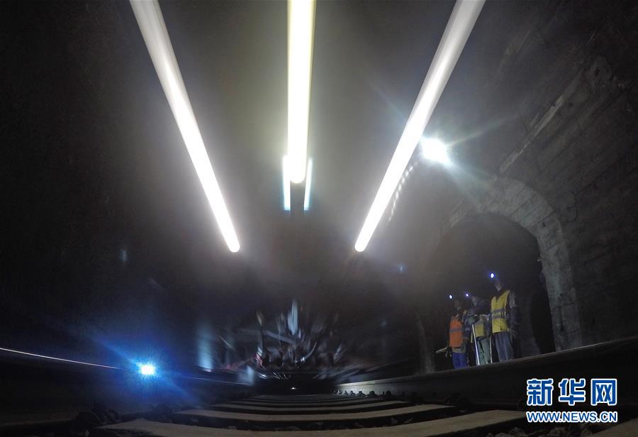 1月9日,在加格達(dá)奇工務(wù)段西羅奇嶺二號(hào)隧道,西羅奇維修工隊(duì)工作人員在避車洞內(nèi)躲避列車。新華社記者王毓國攝
